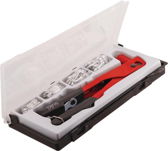 Szegecsek kézi rögzítésére alkalmas. 100 db vegyes méretű (24-48mm) szegeccsel.